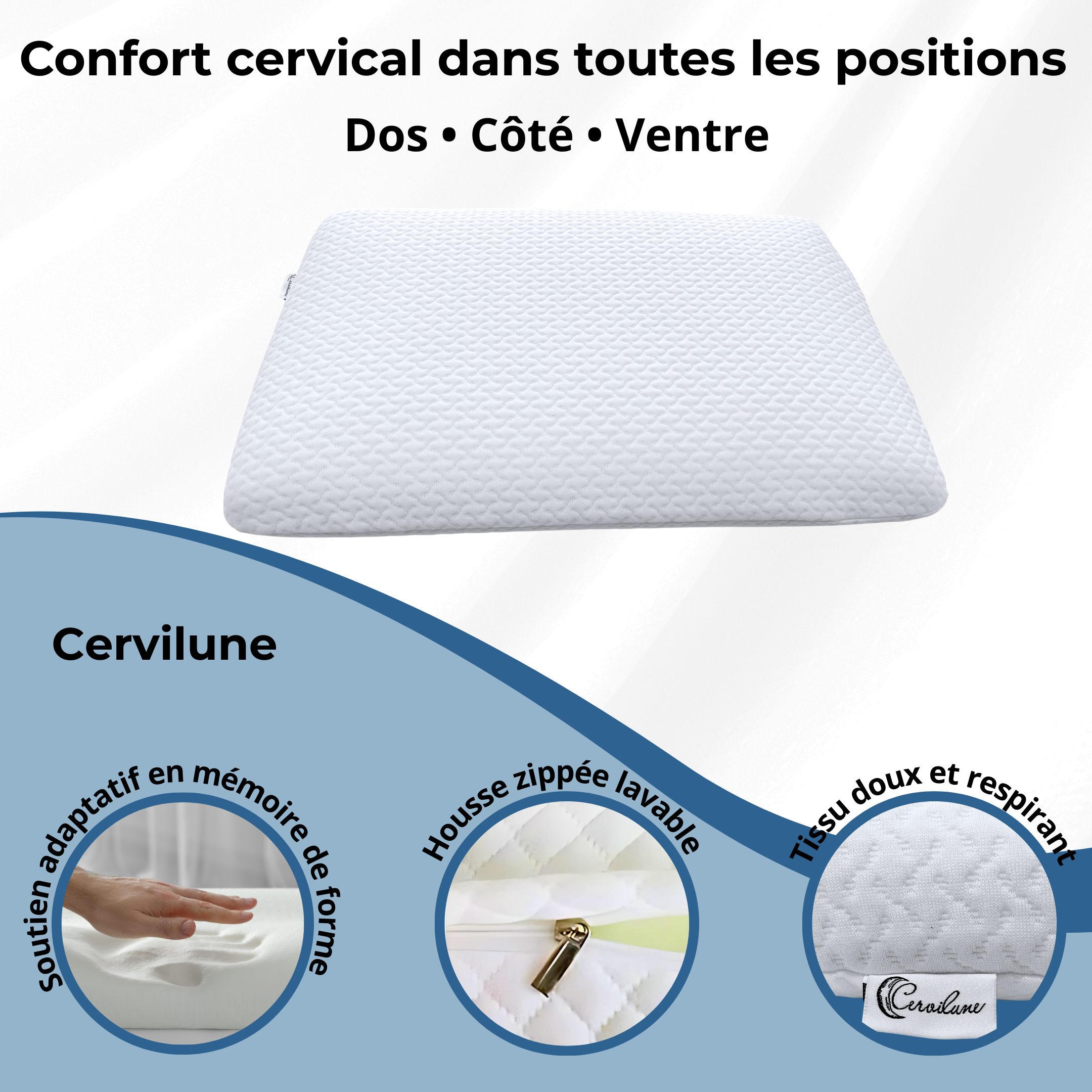 Conçu pour les dormeurs sur le dos et sur le côté, l’oreiller Cervilune s’adapte naturellement à votre morphologie. Sa mousse haute densité assure un maintien stable et durable, idéal pour un confort de sommeil supérieur.