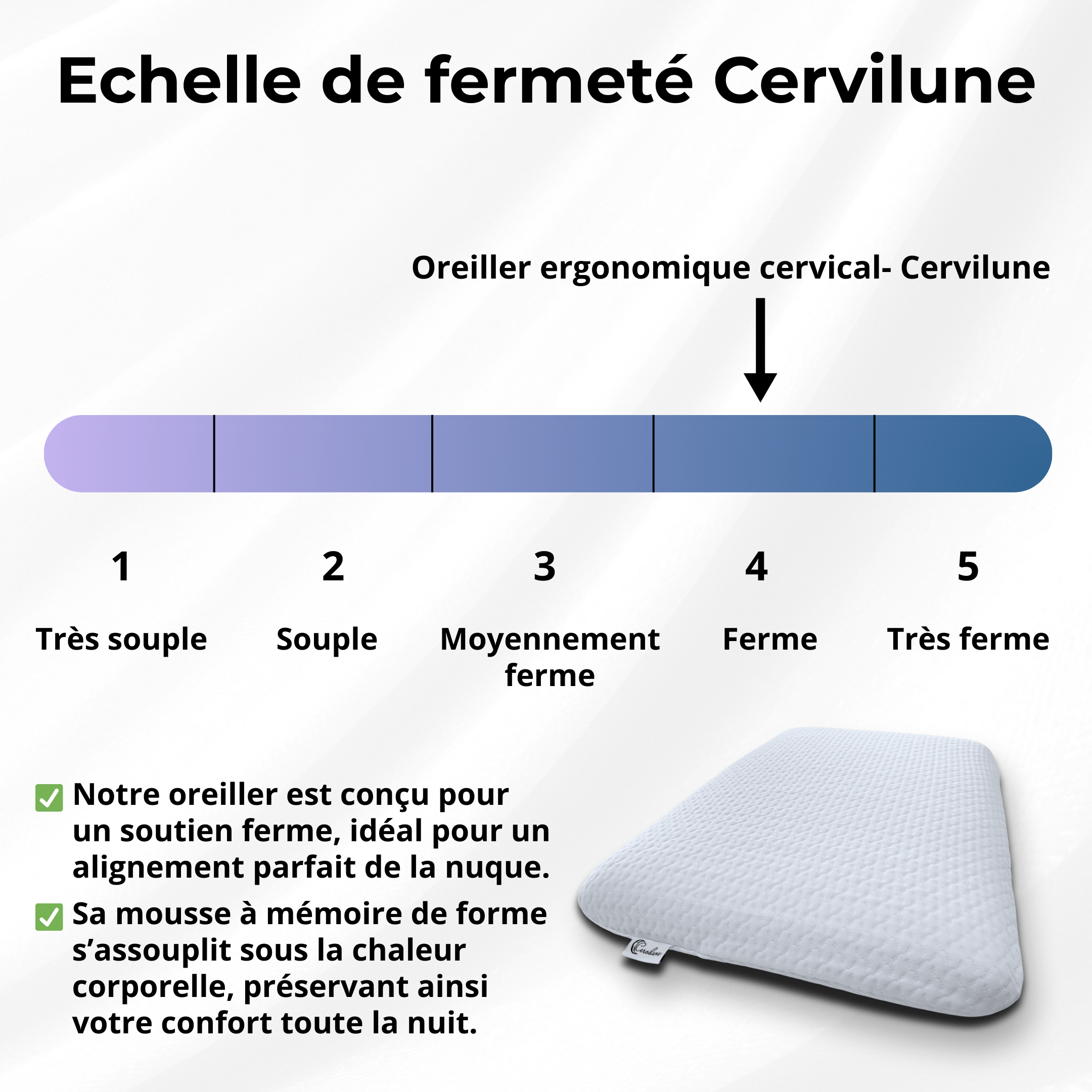 Notre oreiller à mémoire de forme offre un maintien ferme qui soulage efficacement les douleurs cervicales et le mal de cou. Le coussin Cervilune épouse votre tête et votre nuque pour un alignement naturel et un réveil sans raideurs.
