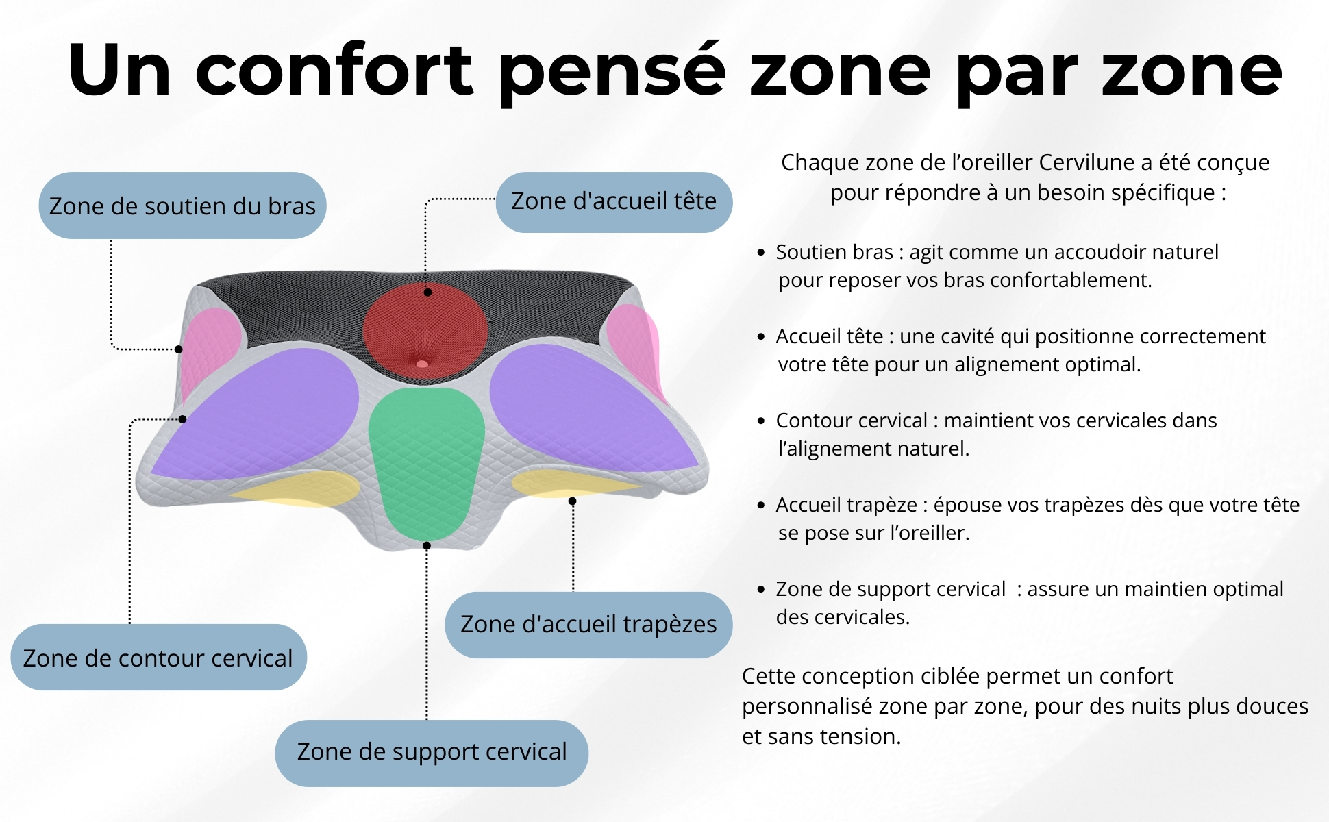 ✅ L’oreiller ergonomique Cervilune est spécialement conçu pour soulager vos douleurs cervicales.